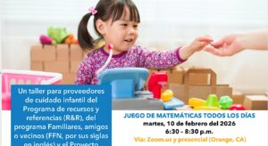 February 10 @ 6:30 pm Este taller tiene como objetivo brindarle ideas, recursos e informacion relacionados con el apoyo al desarrollo de la comprencion matematica